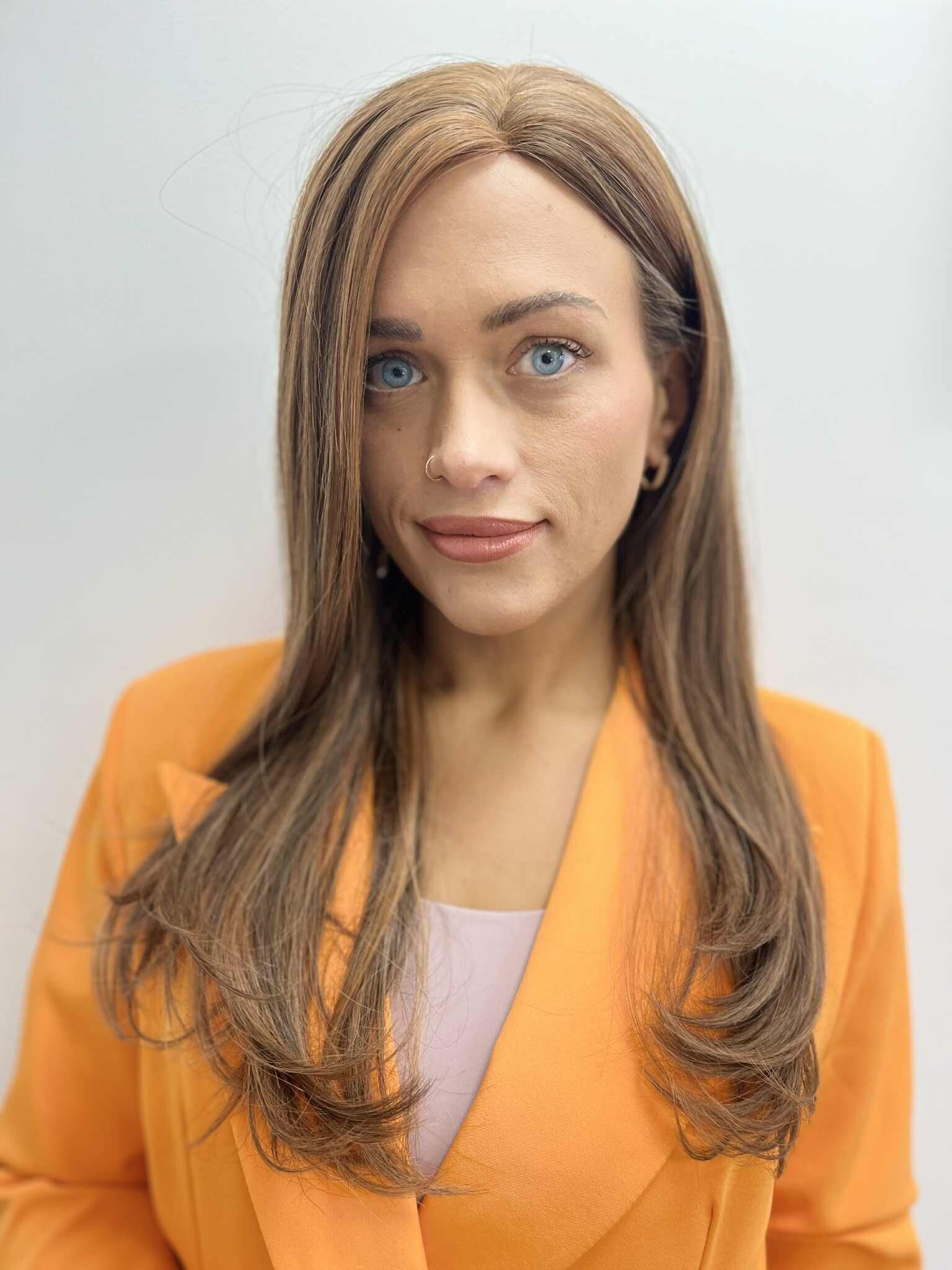 Średniej długości, naturalny włos pięknie pracuje w ruchu, a rozmyta linia lace part sprawia, że peruka wtapia się w skórę i wygląda jak Twoje własne włosy — nawet z bliska.